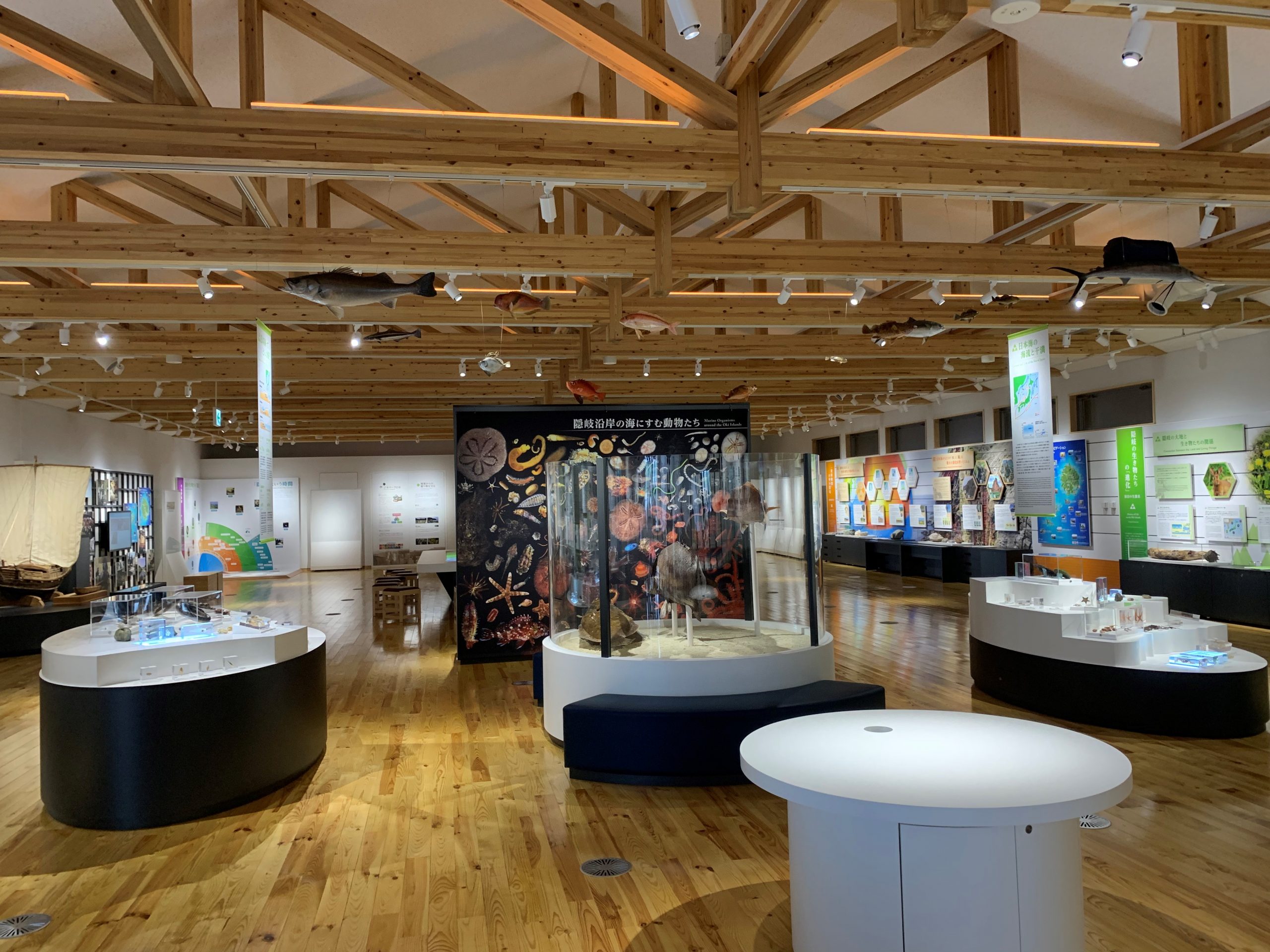 2階は展示機能である「隠岐自然館」となっている。1階と2階をつなげる吹き抜け空間は、「ジオパークエリア」と名付けられた展示のイントロダクション空間であり、エレベーターと階段のある垂直動線の空間でもある。階段を昇ると目の前に海が広がり、振り返ると受付と展示室入口がある。展示室は、収蔵品を守るため、また映像展示を妨げないよう外に対して閉じている。展示室に必要な大空間を確保するため、隠岐の島町産の120角の一般流通材でキングポストトラスを組み、梁間スパン15mを実現した。島の人々が扱いやすい工法として採用したが、結果的に金物も少なく、シンプルな架構の力強い空間となった。