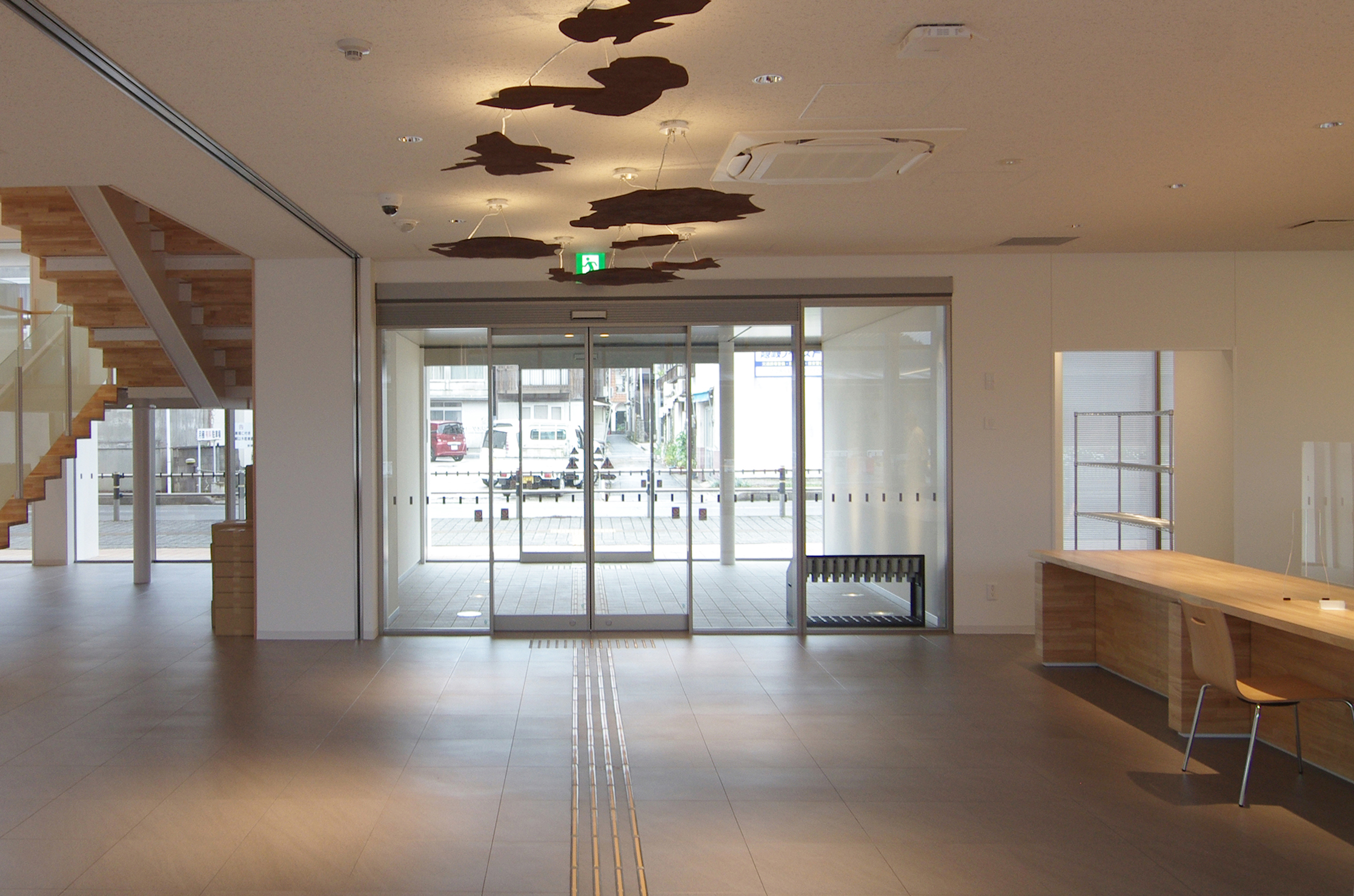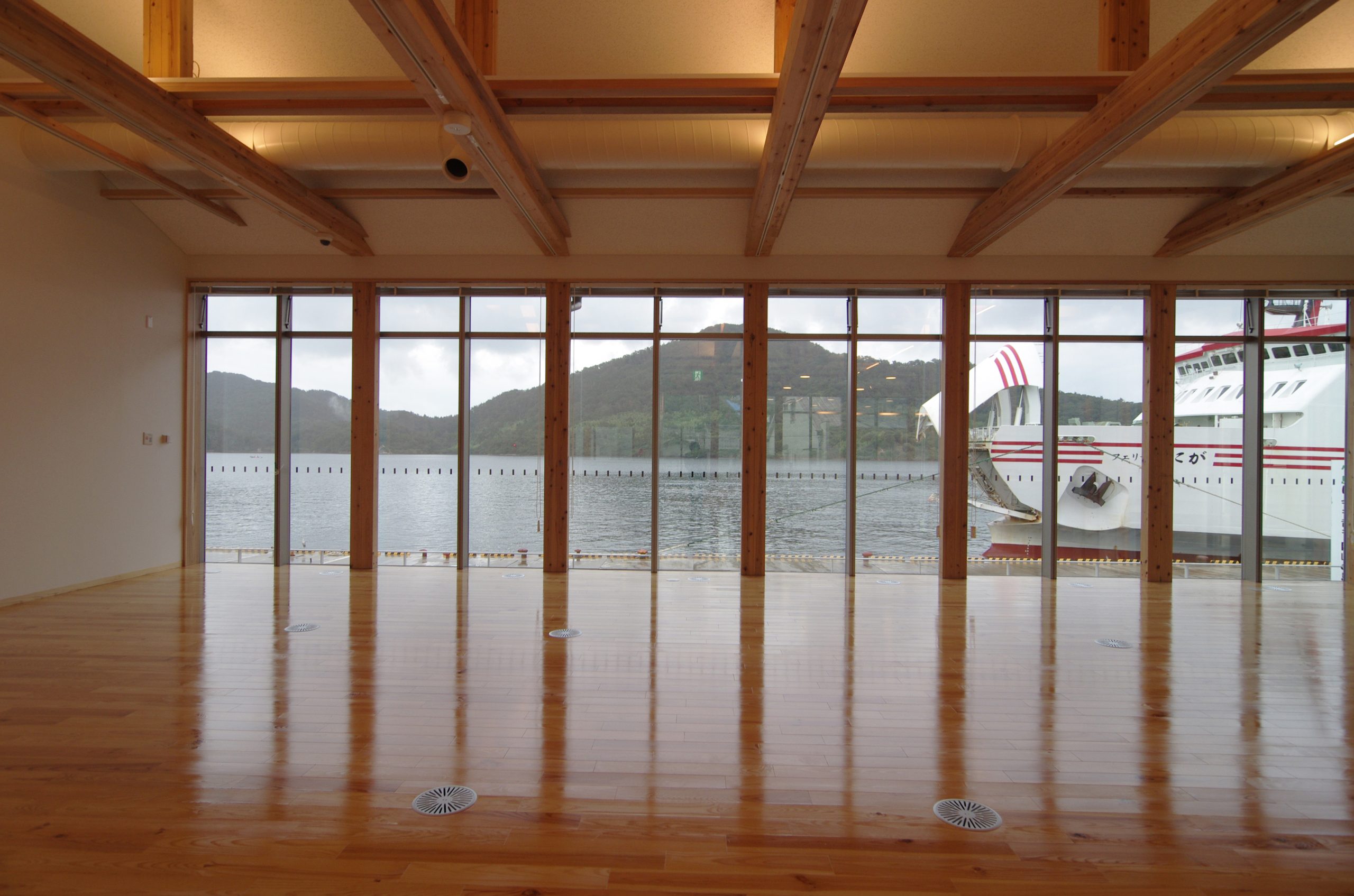 海とまちの間に立地することから、両者の「つながり」が重要と考えた。既存のフェリーターミナルは、まち側に対して閉鎖的な3階建ての壁のようであり、まちから海を感じにくくなっていると感じたからである。津波対策も踏まえ、1階をRC造の耐力壁付ラーメン構造とし、一部鉄骨柱を用いて、海側とまち側の両面に対してできるだけ壁を少なく、開口部を大きく取れるよう工夫した。まちから海に向かう道の延長線上に出入口を配置し、道の軸が海までつながるよう計画した。残念ながらこの道は港の直前で12mの道路により寸断されてしまっているが、視線はつながる。出入口は高速船の乗降ルートから自然に入っていける位置にも配置し、人々が海とまちの「つながり」を感じやすくなるよう計画した。また、この場所は島の交通の結節点であるため、バスやタクシー、フェリーターミナルからの動線に配慮して出入口を分散配置した。2階からは渡り廊下でフェリーターミナルと直結し、フェリーから下りた人が直接足を運べるように配慮した。